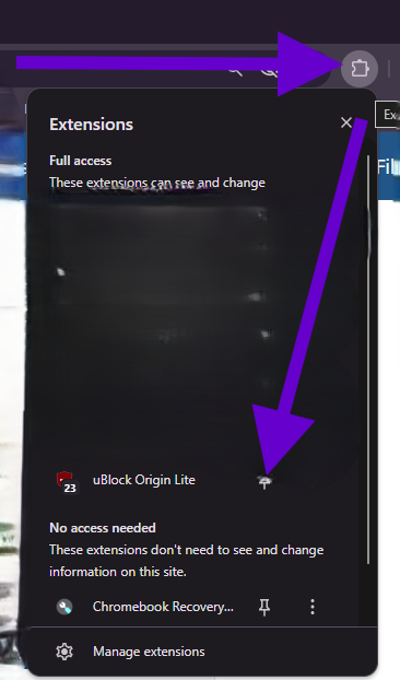 - Then click the thumbtack to the right of uBlock Orgin Lite